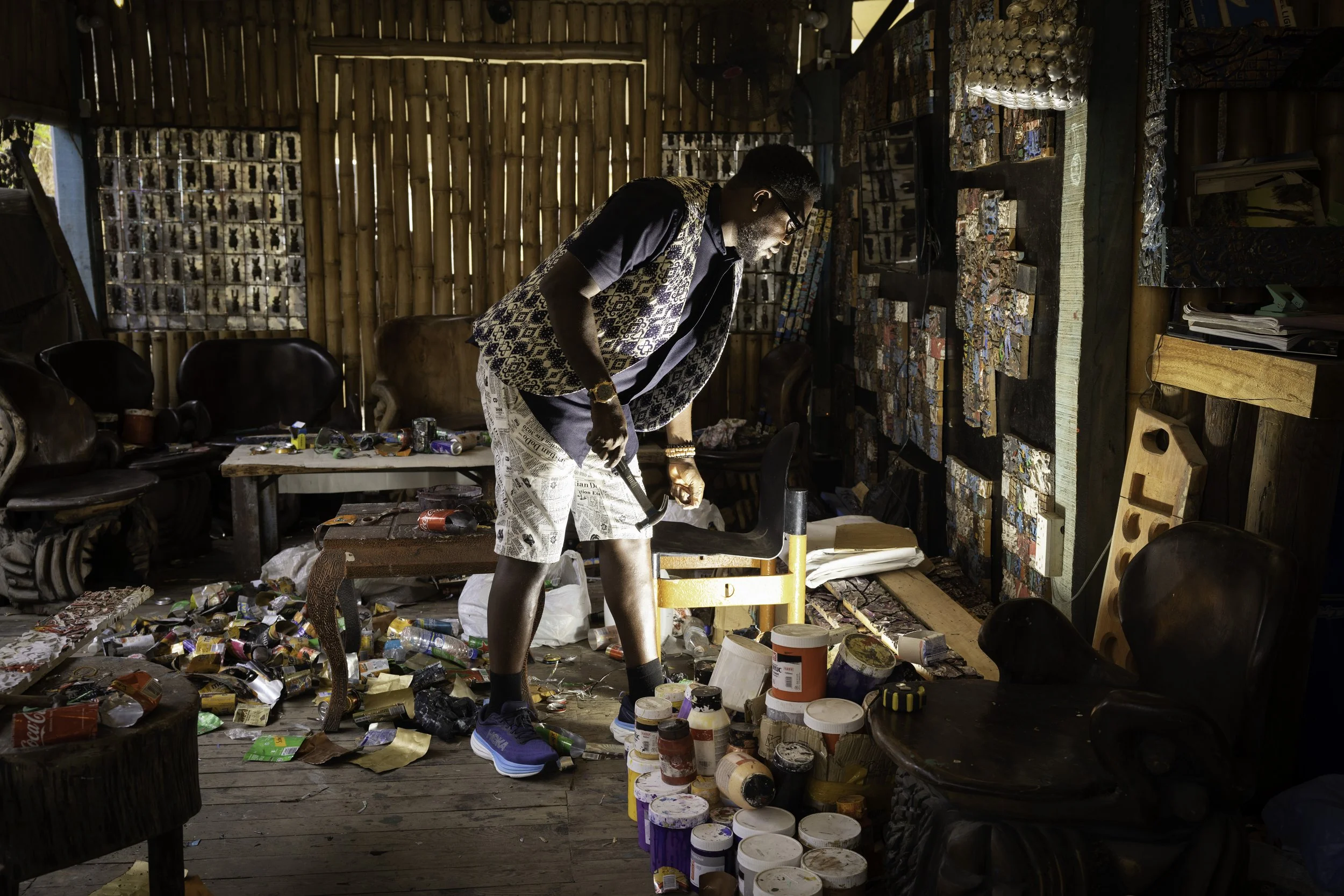 Gerald Chukwuma (b. 1973) lives and works in Lagos, Nigeria. He graduated in 2003 with First Class Honours from the University of Nigeria, Nsukka. Chukwuma is one of Nigeria's fastest rising contemporary artists, noted for his intricately crafted sculptures on wood panels. The materials he chooses are common enough; however, using in his unique way a range of techniques — including burning, chiselling and painting — he captures a richly layered history that is imbedded with personal and political meaning. The use of traditional Uli and Nsibidi symbols links his work to the Nsukka art tradition which is credited with expanding and modernising the Igbo cultural aesthetic. Meanwhile, the transformation of found objects into highly detailed artworks roots him firmly in the contemporary moment, with its concern for rapid environmental and ecological change. .