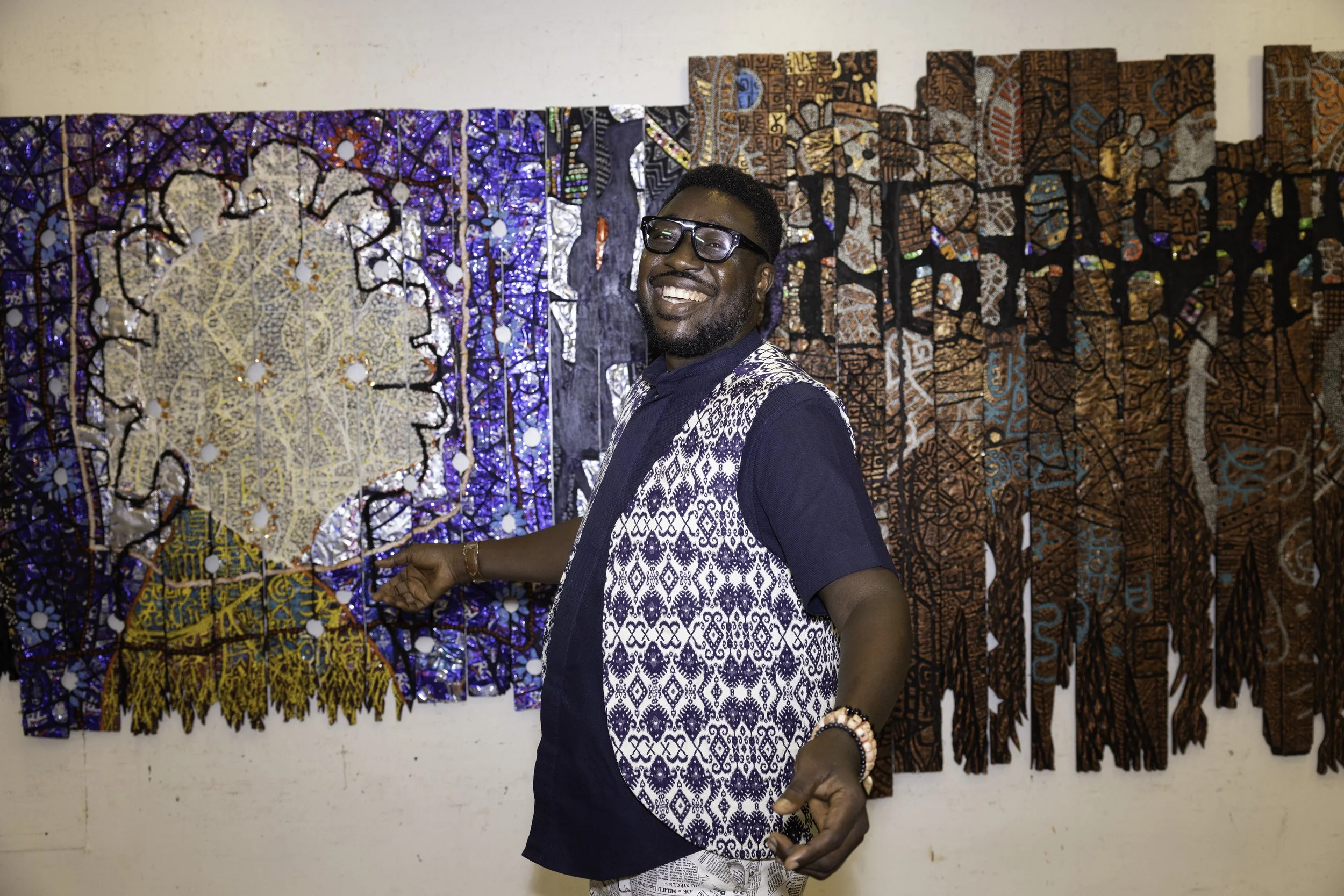 Discover Gerald Chukwuma’s richly textured sculptures and wood panel works blending Uli and Nsibidi symbols, exploring heritage, politics, and Lagos vibrant art scene.